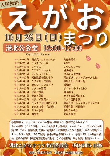 10月26日は港北公会堂にて「えがおまつり」が開催されます。当社は当日、住まいに関する色々なお悩みがある方の、ご相談を聞きして解決策をご提案致します。相談料は無料ですので、是非この機会を有意義にご利用ください。イズミ住建有限会社は、創業40年の不動産管理業者です。皆様が笑顔で暮らす生活のお手伝いにこれまでもこれからも邁進して行きます。